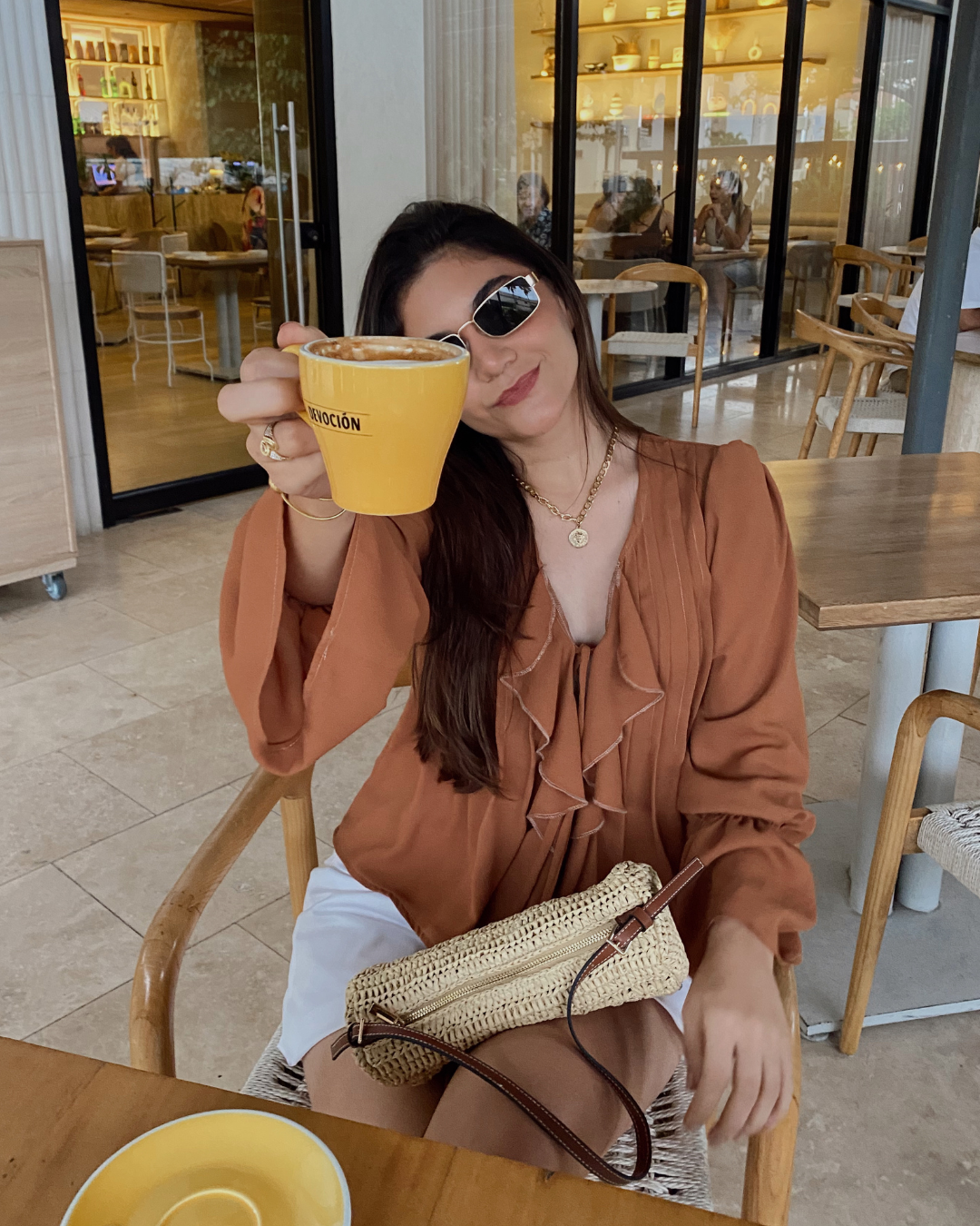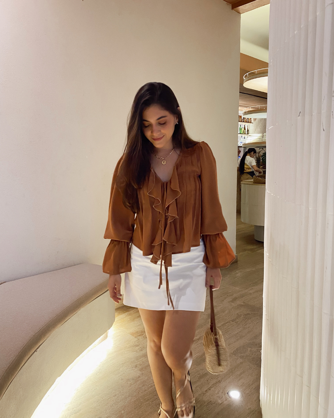 Blusa inspirada en él estilo Boho Chic – Con mangas largas y holgadas, ajuste con tiras y volantes, en la parte delantera.