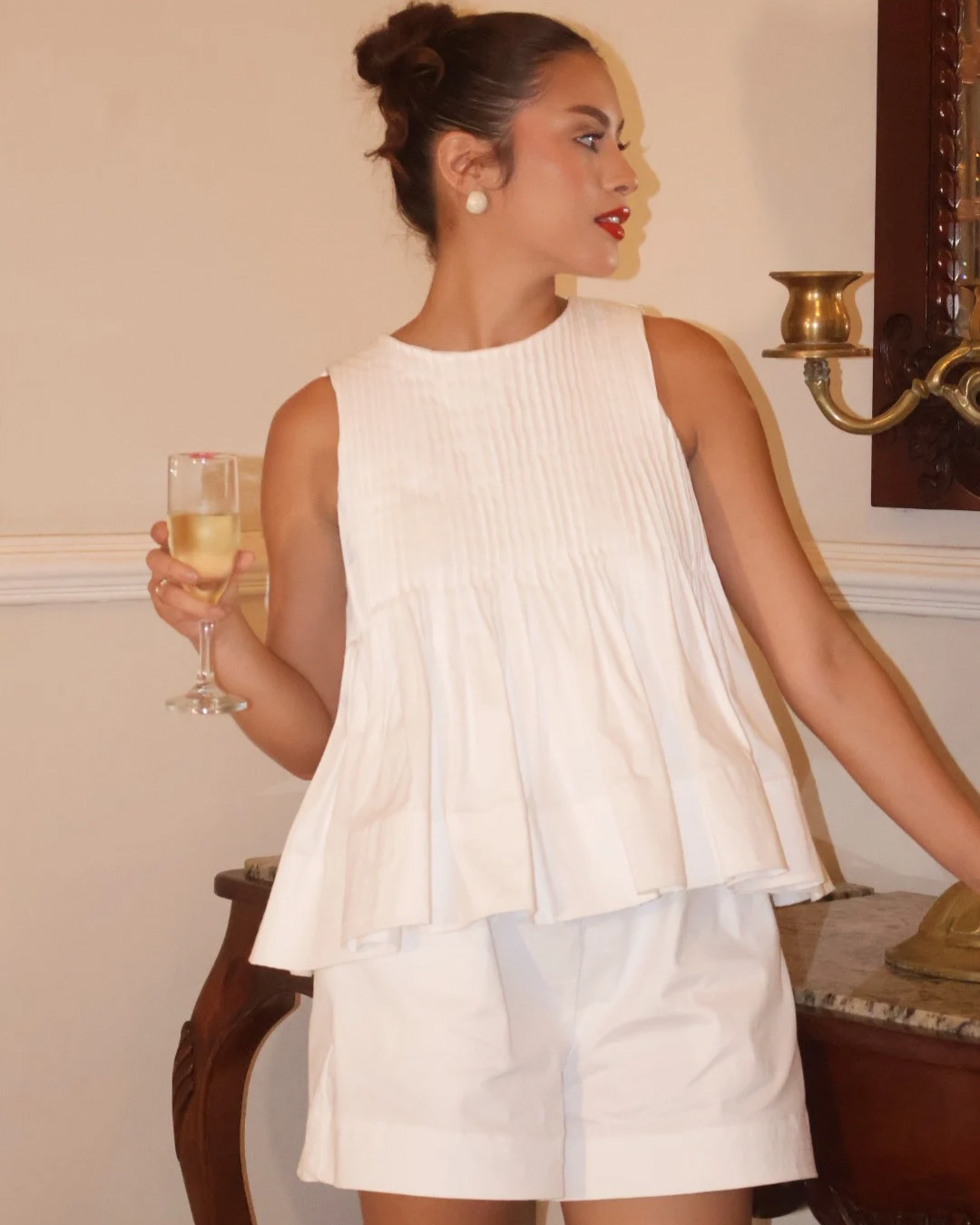 Set de dos piezas. Blusa con pliegues , sin mangas. Short de altura media con detalles.