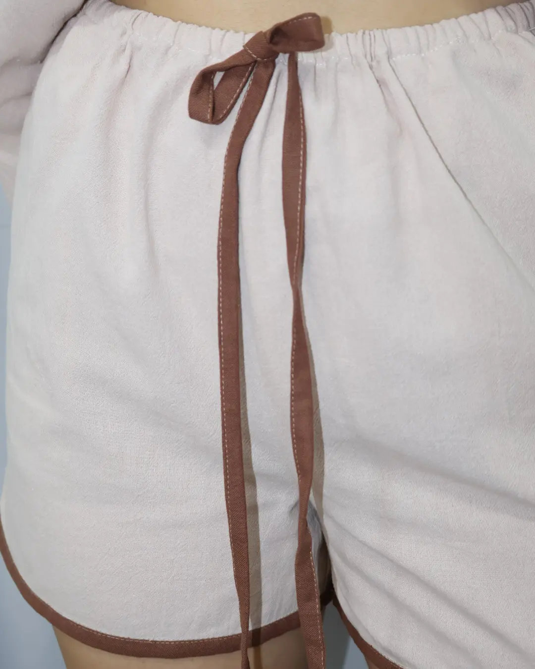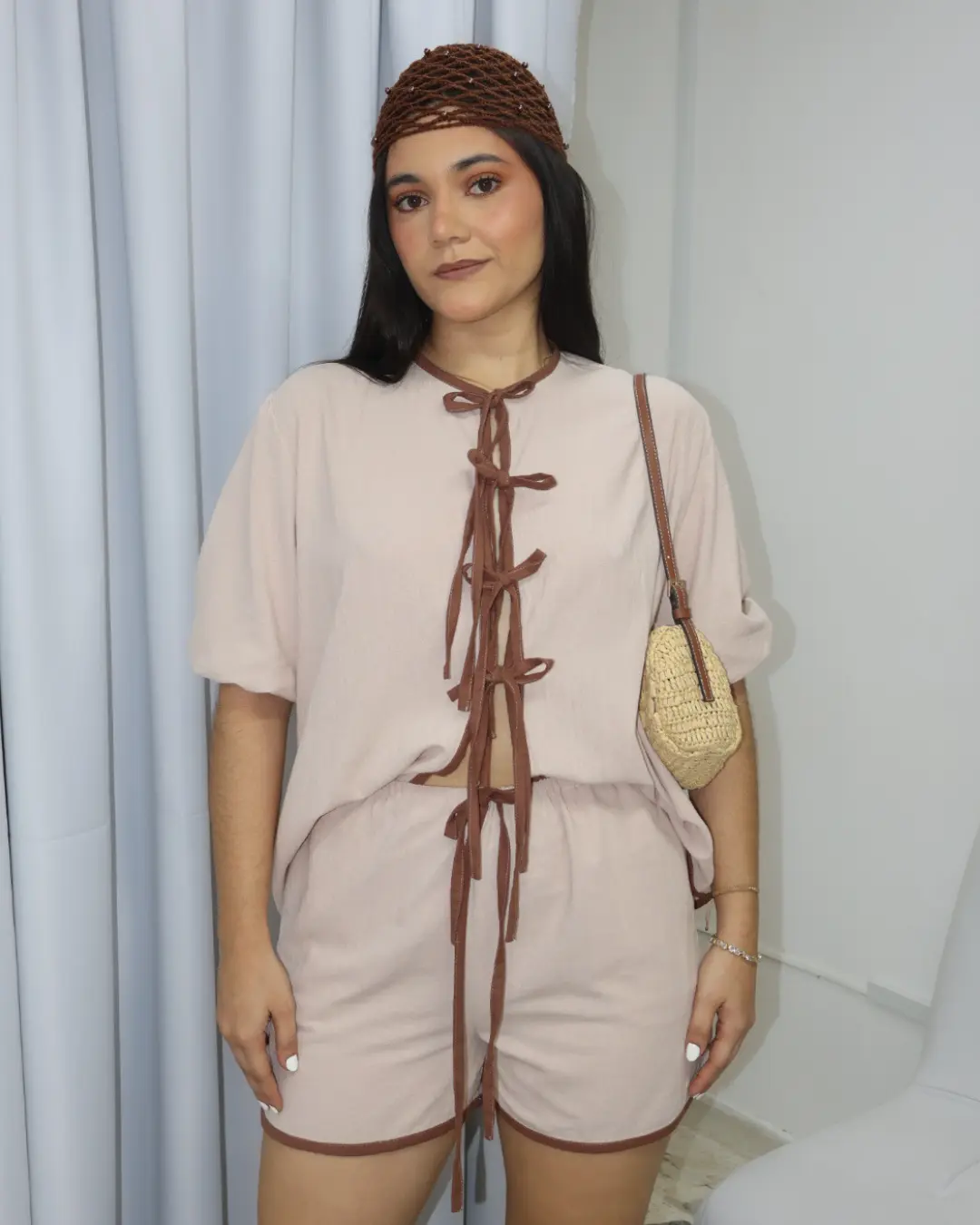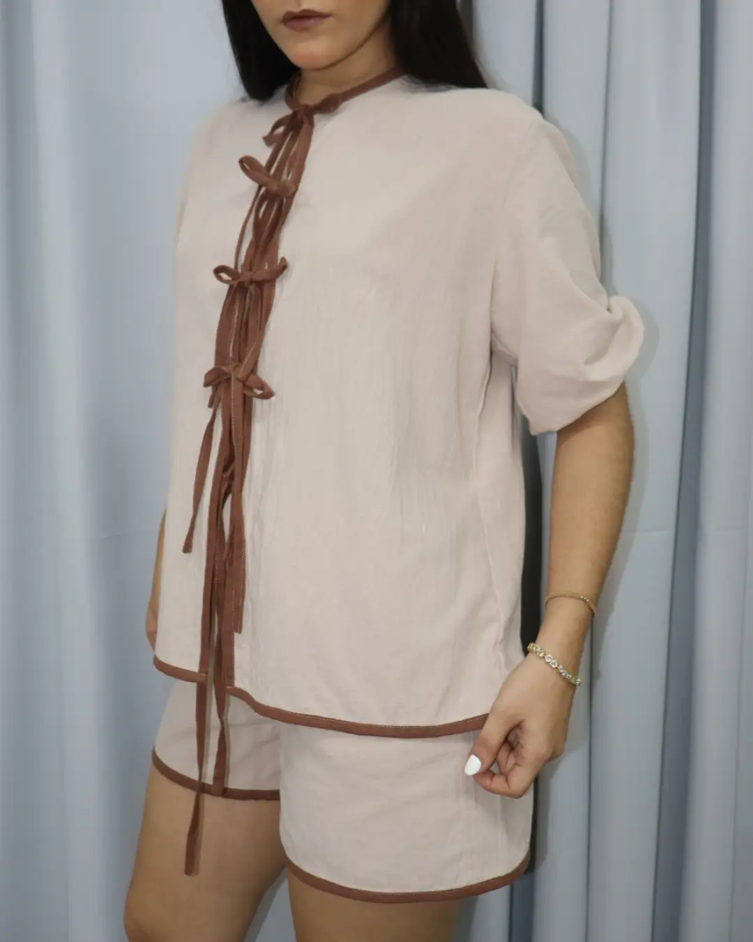 Set de dos piezas, con blusa de corte abierto, con ajuste de 4 lazos ajustables, mangas de corte medio y silueta holgada, con short de ajuste en lazo y elástico en pretina.