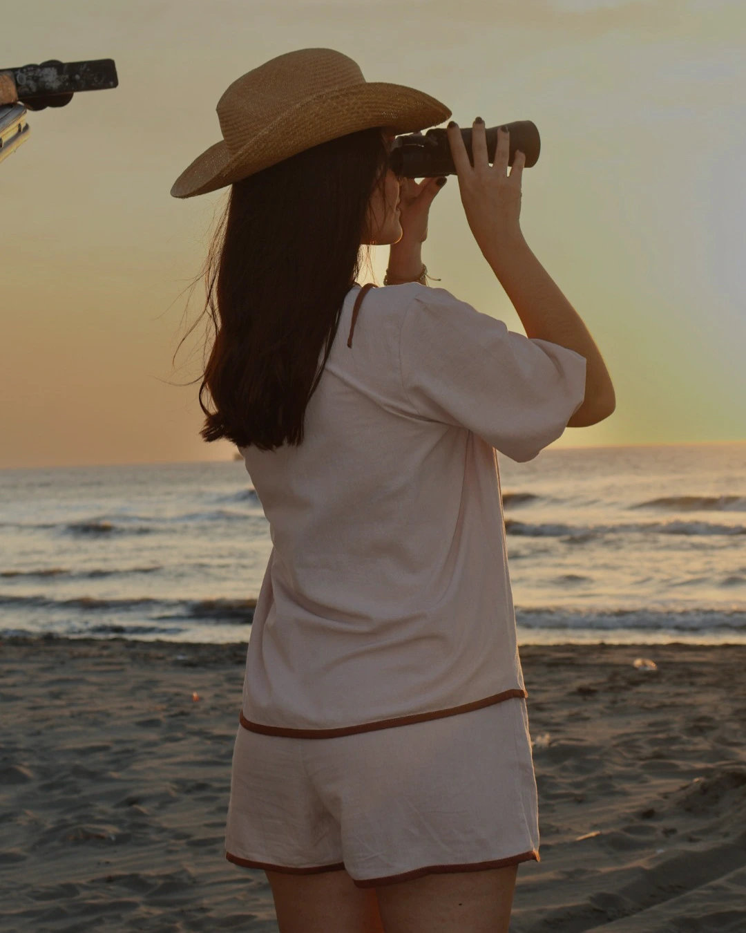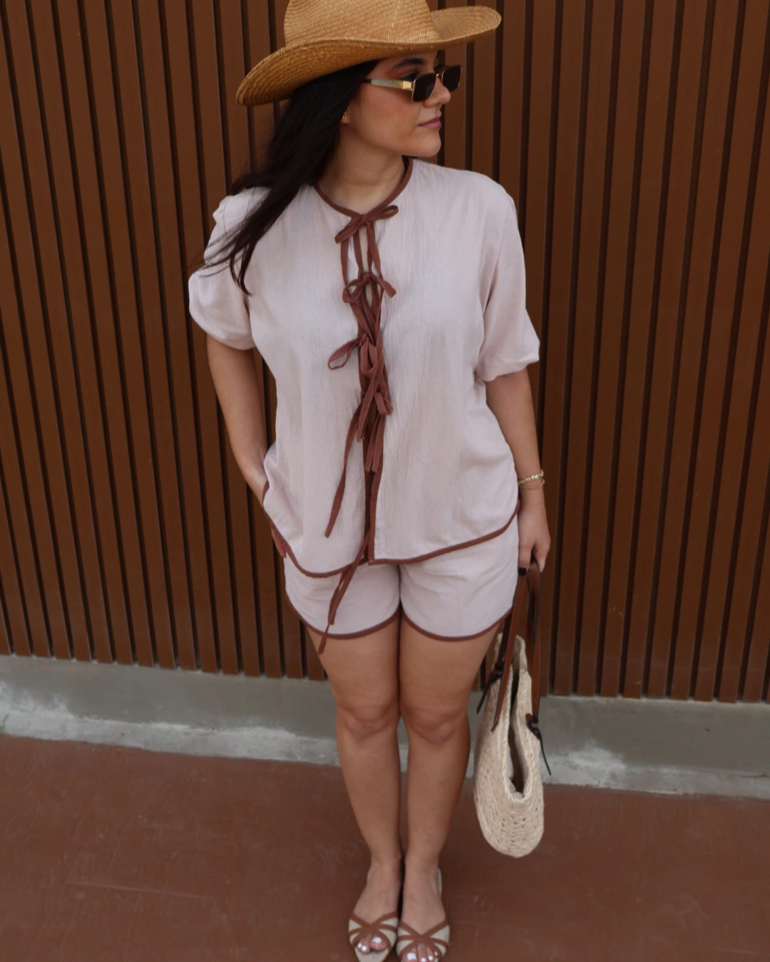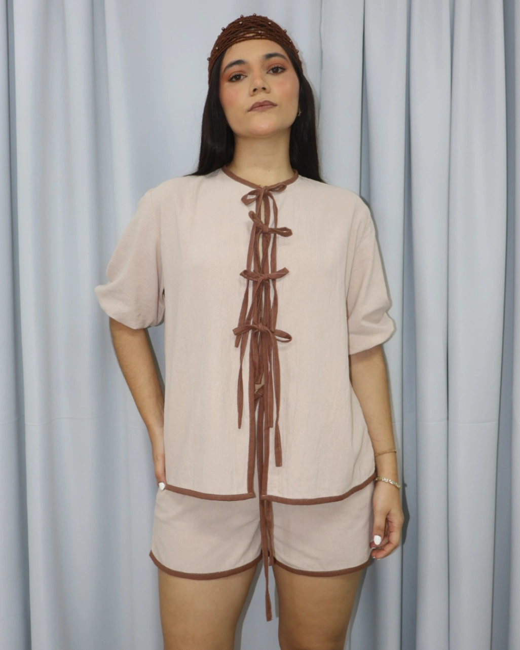 Set de dos piezas, con blusa de corte abierto, con ajuste de 4 lazos ajustables, mangas de corte medio y silueta holgada, con short de ajuste en lazo y elástico en pretina.
