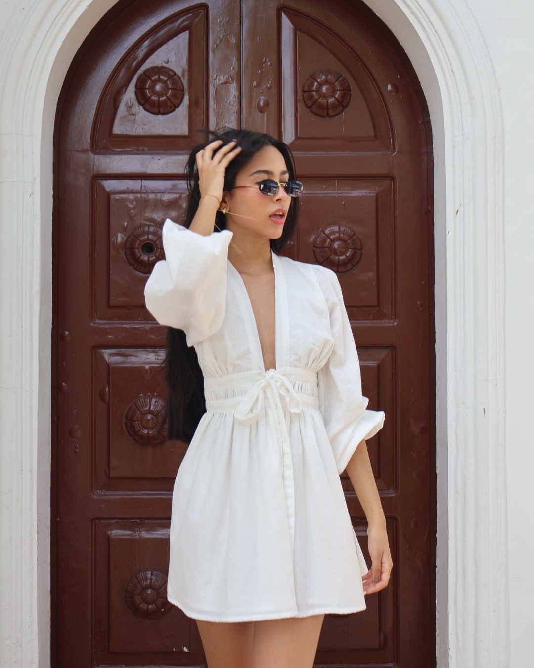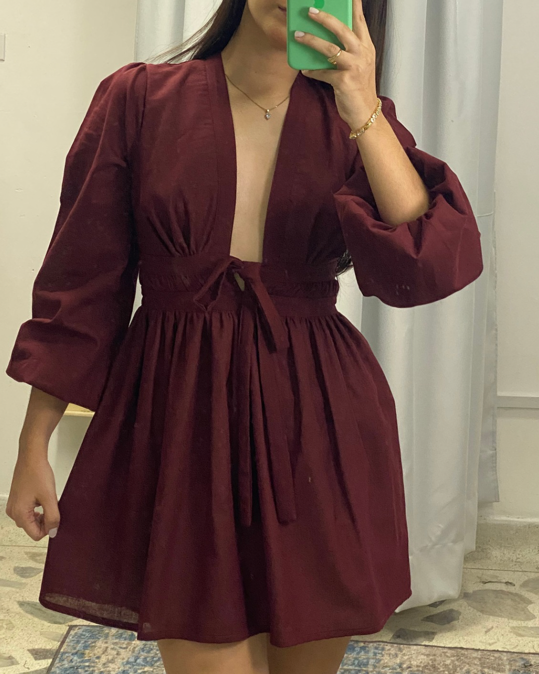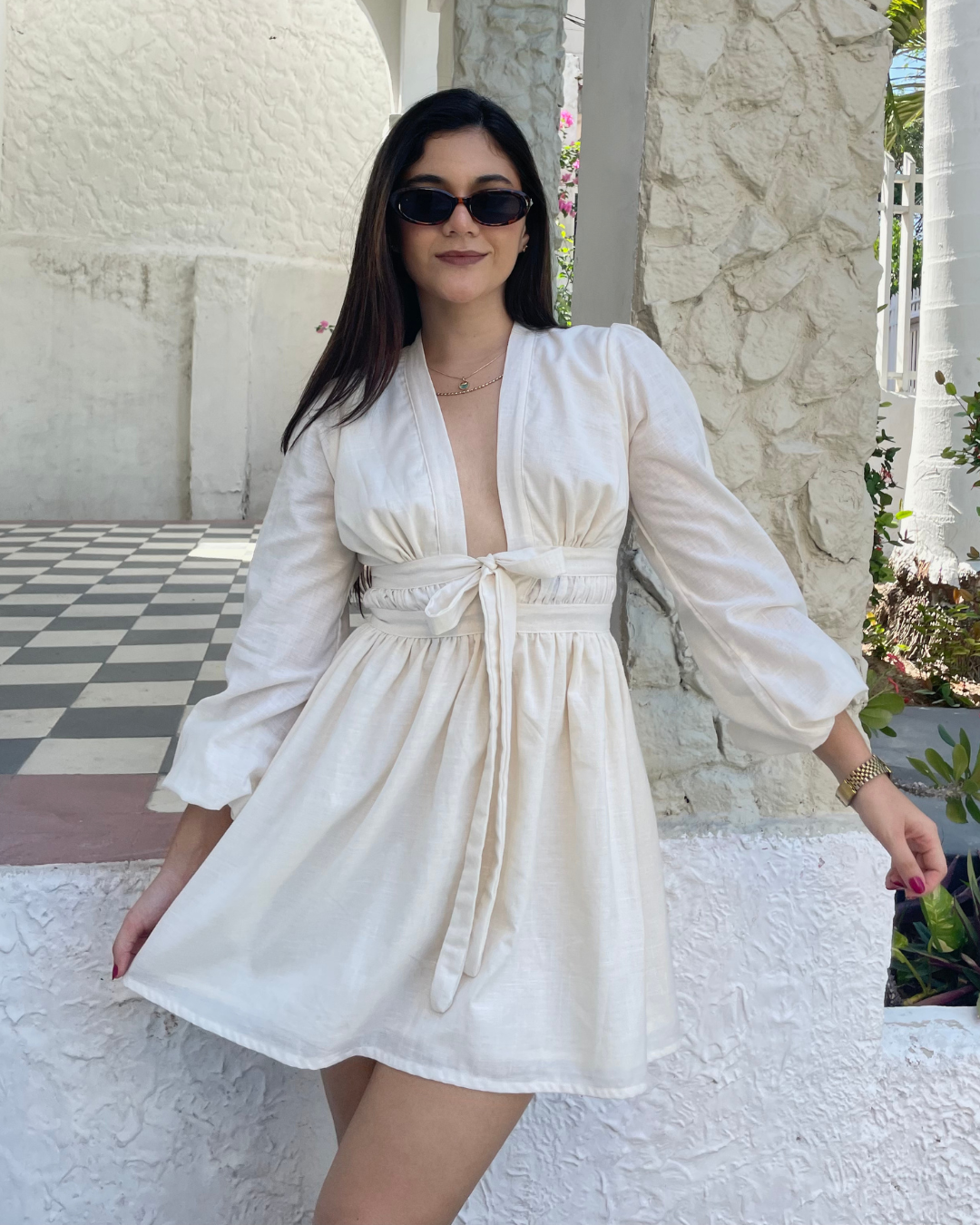 Pieza elaborado en lino, escote pronunciado con ajuste de lazos y cierre en la parte posterior.